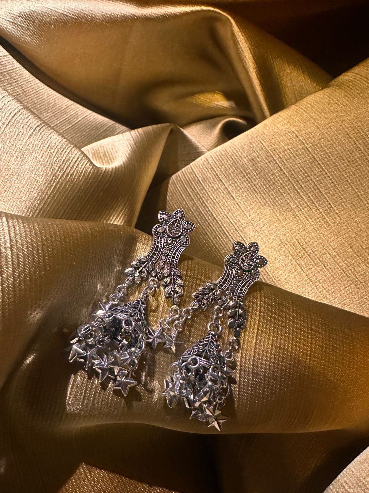 Sparkle with every move! These oxidised jhumkas feature delicate star danglers and floral tops, perfect for festive wear and ethnic celebrations